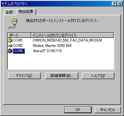 9. [モデムのプロパティ]画面に戻りますので、[検出結果]タブをクリックし、ご利用されるターミナルアダプタを選択した状態で[詳細情報]をクリックします。
